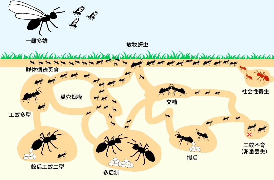 在蚂蚁群体中,工蚁是不具繁殖能力的雌性个体,它们负责觅食、筑巢、照顾幼虫等日常工作;蚁后则是群体中唯一具备繁殖能力的雌性个体,专门产卵,维持整个群体的延续。
