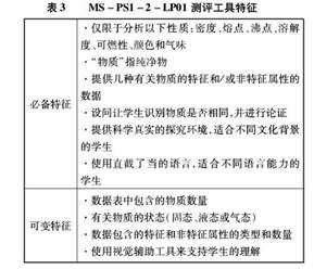 表3显示,测评工具的设计特征包括测评工具的必备特征和可变特征两类。必备特征是保障测评工具能够准确考查学生在某一学习表现上的达成情况而具备的表征,如针对MS-PS1-2-LP01的必备特征紧紧围绕“特性”“物质”及其具体内容,是试题必须考查的内容。同时要求测评工具语言直接,探究环境真实。可变特征,如问题情境中物质的数量、是否使用视频等,不是试题命制的必须要求。确定可变特征是为适应不同水平学生的需求,开发出难度各异的系列测评工具。