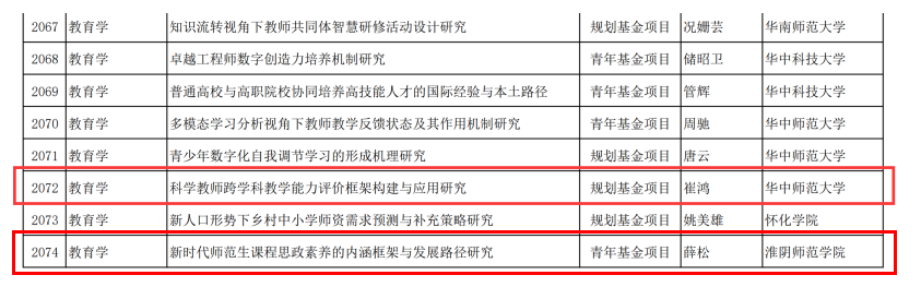 根据教育部社科公示的2023年度教育部人文社会科学研究一般项目评审结果,教育学类的人文社会科学研究一般项目共有261项申报成功,其名师工作室负责人崔鸿教授的“科学教师跨学科教学能力评价框架构建与应用”项目顺利申报成功,2021届博士薛松的“新时代师范生课程思政素养的内涵框架与发展路径研究”也成功立项。这一成果充分彰显了本名师工作室在科学教育和教师教育领域的学术积淀。