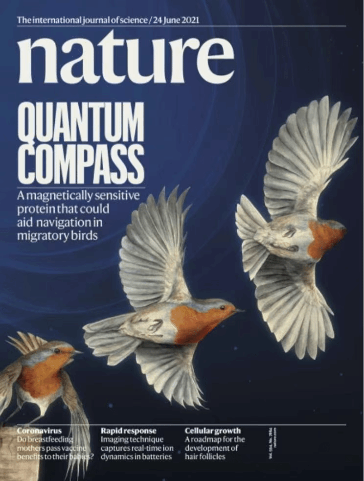 首先,地球的地磁场是一个有方向和大小的矢量场,鸟儿可以感受地球磁场,通过地磁场定向。有科学家进行了“定向笼实验”,将欧亚鸲(Erithacus rubecula)放置于一个有不同方向栖位的笼中,并在夜间记录鸟的活动。经过一段时间观察发现,欧亚鸲在笼中持续活动的方向正是它要迁徙的方向。此外,科学家在欧亚鸲等鸟类的眼睛里发现了一种名为隐花色素(Cryptochrome4,Cry4)的蛋白。研究表明,这种蛋白对磁场高度敏感,可能发挥了“罗盘”的作用。鸟类运用地磁场定向是一种广泛存在的导航机制,不论在迁徙途中还是日常,只要需要定向,都会借助地磁场。
