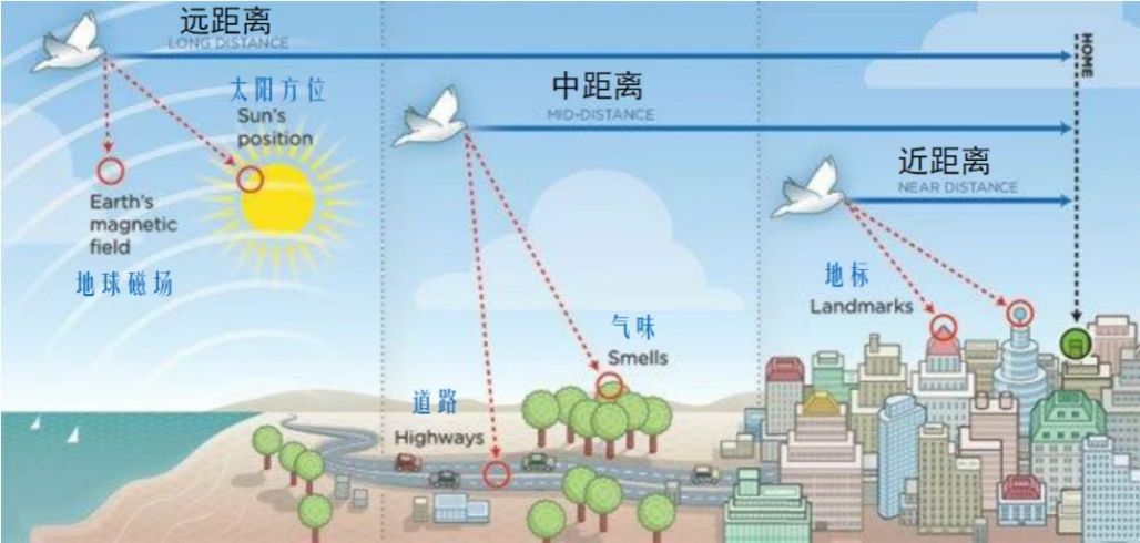 还有一种导航方式叫陆标定向,和我们认路的方式相似,鸟儿在飞行中也会记住一些显著地面标志,比如河流、山脉、建筑物等,作为飞行中的“路标”,熟悉的路标可以帮助信鸽提高辨路能力,快速归巢。