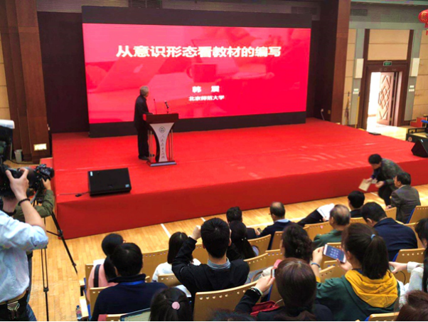 首届中小学教材论坛上,北京师范大学教授韩震作了《从意识形态看教材的编写》主题报告。(李依环/摄)
