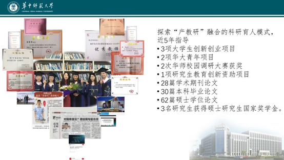 我积极地投身工作。承担了《化学教学论》等9门课程的教学,坚持“课程思政”,引领师范生勇担“立德树人”使命;坚持开展基于移动学习共同体的教学改革,省级教改项目结项验收时被评为优秀。指导学生在各级各类师范教学技能比赛中获得国家级奖项14项,省级奖项3项。