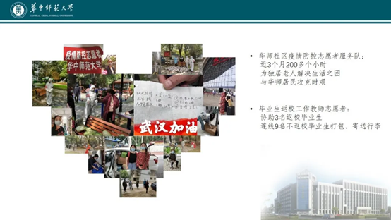疫情期间,我积极响应党的号召,2月、4月两次加入华师社区防疫值守志愿者服务队,用热忱的态度在近3个月200多个小时的志愿服务中,为独居的老人解决生活之困,与华师居民共克时艰。第一个主动报名毕业生返校工作教师志愿者,用“特殊毕业礼”向学生传递母校之爱、师生之情。