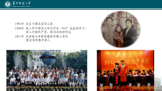 1981年我出生在湖北省京山县一个普通的公务员家庭,父母取名为“佳”寄予着对我美好的期望。一路以来,我一直努力学习,“98抗洪”那年的秋季,我进入华中师范大学化学系“4+2”试验班学习,加入中国共产党,并被保送本校攻读研究生;2011年在西南大学获得博士学位后,重返母校教书育人。