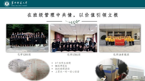 主持省级班主任项目1项,形成基于学习共同体的卓越教师班级建设模式,所带班级获得学校“最佳师范生集体”和“爱心团支部”等荣誉称号,受到《大学生就业》杂志采访,同时,我还获得了“三育人先进个人”等一系列荣誉与奖项。