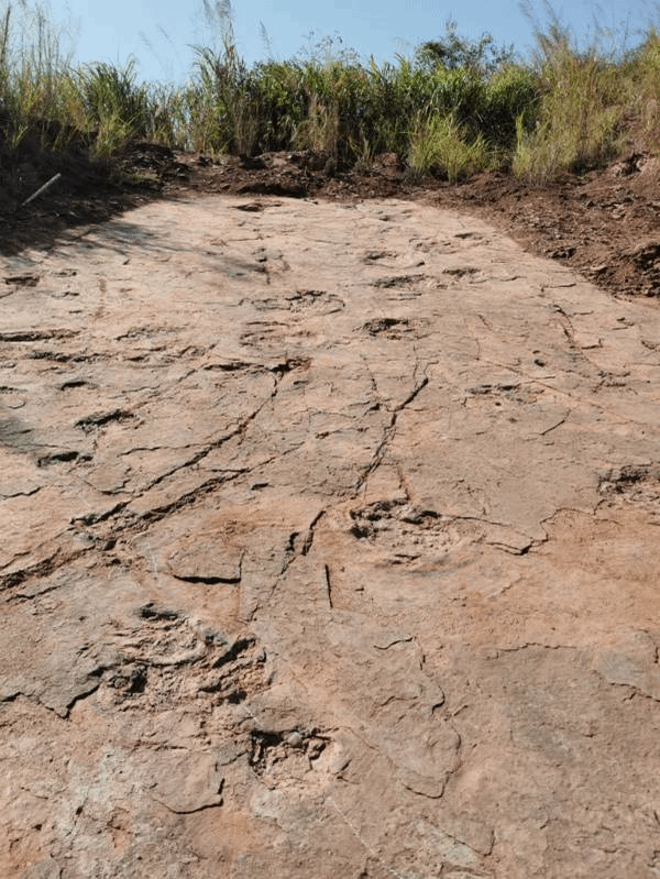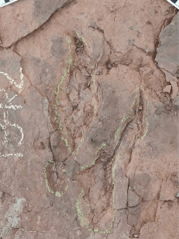 有人也许会好奇,足迹也是化石吗?没错,除了我们熟悉的恐龙牙齿和骨骼化石,以及恐龙蛋化石,恐龙的遗迹(如足迹、巢穴、粪便或觅食痕迹)也有可能形成化石保存下来。如恐龙足迹化石就是它们活着的时候在柔软的泥沙地面上行走所留下的痕迹被保留下来而形成的。