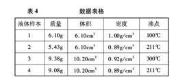 现有四个装有未知液体的瓶子,马兰达测量了四种液体样本的质量、体积、沸点,计算出液体的密度,相关数据见表4。她想知道液体样本中是否存在相同物质,请你帮助马兰达回答下面两个问题: