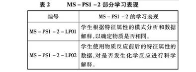 仍以MS-PS1-2为例,说明学习表现的构造过程。图1显示,围绕“物质”与“特性”需要的三维目标是:运用“分析和解释数据”;联系“模式”学习;“物质由它们的特征属性来鉴别”,由此构造的两条学习表现如表2所示。