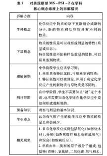 拆解表现期望要从学科核心概念、共通概念和科学与工程实践三个维度分别解读表现期望对知识和能力的实质要求。例如,从学科核心概念维度对表现期望进行解读包括:准确定义学科术语的含义,确定各年级学科核心概念的理解目标水平,拆解构成核心概念的下属概念,界定各年级学生概念理解的界限,关注学生背景知识及其对学科核心概念理解的促进作用,调研学生的迷思概念及其对概念理解的妨碍作用。表现期望MS-PS1-2在学科核心概念维度上与化学反应有关的解读结果如表1所示。对另两个维度也需要进行相应的解读,这里不再赘述。