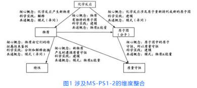 在三个维度上对表现期望进行拆解后,创建以学科概念为框架的目标表现期望的维度整合图。图1是涉及MS-PS1-2的维度整合图,展示了该表现期望的达成必须围绕化学反应对物质、原子团、质量守恒等学科概念进行相关学习,图中有向线段旁的注释说明了三个维度上的具体内容。