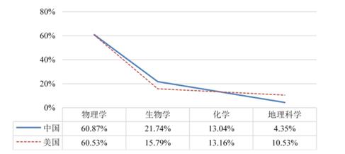 中美STEM课程均秉持跨学科的特点,绝大部分课程渗透跨学科的其他知识。经统计发现,美国课程平均课包含知识点数目(案例知识点总数/案例数)为2.94,中国课程平均包含知识点数为2.46,因此,美国课程所涵盖的平均知识点数大于中国。在科学知识方面,两个国家均呈现S(科学知识)>T(技术知识)>E(工程知识)>M(数学知识)的设计特点。首先,中美STEM课程中科学知识占比最多,科学知识和技术知识关联紧密。经过编码分析,中国STEM课程中科学知识共有23个,占比35.38%;美国STEM课程中科学知识共有39个,占比57.35%。两国科学知识的学科分类看,物理学占比最高,中国课程的物理学知识出现14次,占科学知识总数的60.87%,美国课程的物理学知识出现23次,占科学知识总数的60.53%(图4)。其次是生物学,中国占比21.74%,美国占比15.79%。化学和地理知识占比均小于15.00%。在中国的26个课程中,科学与编程技术相结合的课程有10个,占所有课程的38.46%,科学与建造设计相结合的课程有9个,占34.62%。相比之下,美国STEM课程更加关注科学与建造设计的结合,总共有14个课程,占比73.68%。