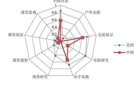 另外,中美两国STEM课程对户外探索活动关注度均不高。户外探索活动一般包括野外观察、户外样本采集等活动。受课堂环境限制以及处于安全性考虑,中美STEM课程都鲜有户外探索活动。目前,中美两国都在教室或者实验室中模拟户外的场景,如利用瓶子,水和细沙模拟钟乳石的形成,用塑料玩具模型和大的塑料盒子模拟捕鱼过程等。尽管教师为了安全性尽可能地将户外真实环境还原到课堂中,但是学生却不能有身临其境的体验。因此,在真实活动的课程实施与课堂环境现实之间呈现出的活动理论的冲突方面,可以在课堂中或校外兴趣小组或非正式活动中适当安排时间进行户外观察和实践,以收集课堂用到的数据和测试学生作品的效果。