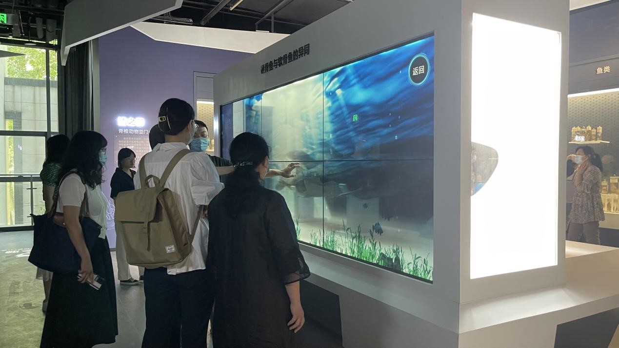 图1 生命科学学院实验技术员周权介绍“鳍之漪”陈列展示区
