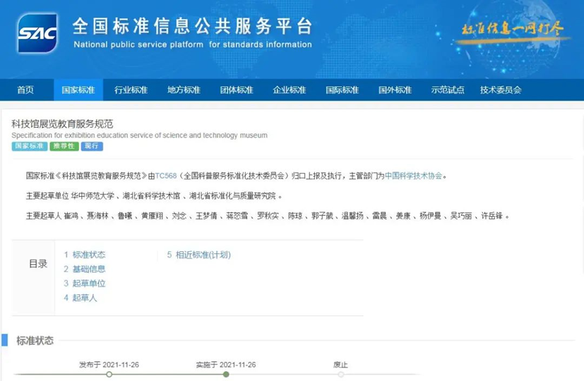 根据《中华人民共和国国家标准公告(2021年第14号)》,由华中师范大学生命科学学院崔鸿教授团队联合湖北省科学技术馆、湖北省标准化与质量研究院研制的推荐性国家标准《GB/T 41131-2021 科技馆展览教育服务规范》已于2021年11月26日正式发布实施,这是中国第一份关于科学教育的服务型标准,对科技馆行业的规范化、科学化发展具有重要意义。